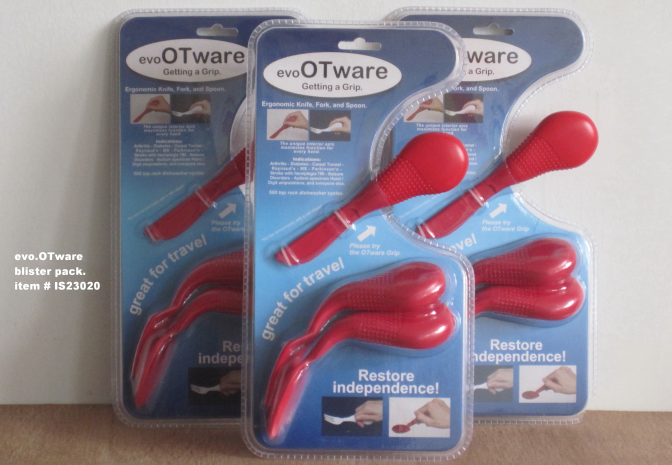 and continues…”The beauty of evo.OTware is that you don’t have to be able to have a neutral or extended wrist. So someone with a wrist contraction (due to arthritis, CP or whatever) could actually have a flexed wrist and still be able to use it. The real benefit is that you can eat with the evo.OTware regardless of your wrist position.