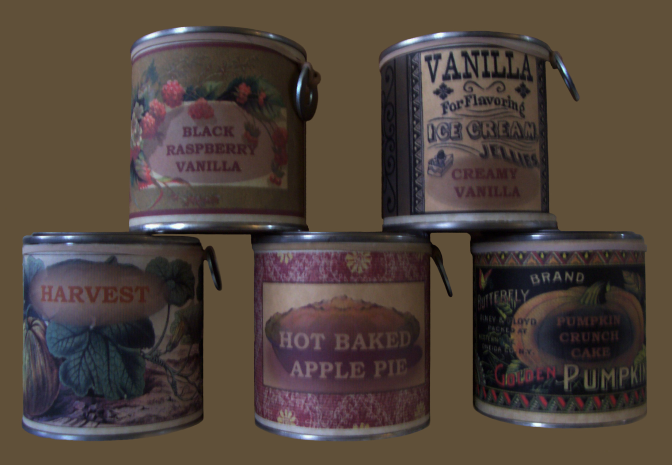 Our Paint Can Candles with Vintage Labels are available in many fragrances. Each candle is poured into an 8 oz. paint can and is accented with a vintage label designed for the fragrance inside. Hardware "washer" attached for easy-open lid.