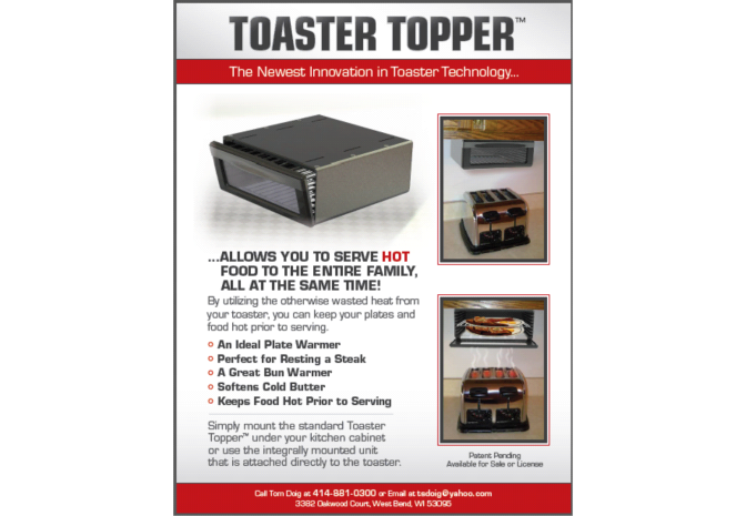 Given the option, not a single person surveyed would rather eat a hot meal on a cold plate. Breakfast, lunch or dinner, the Toaster Topper™ is low-cost, quick, simple and safe alternative to other methods of heating plates and/or staging food in a hot-box prior to serving.