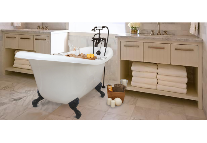 American Bath Factory presents the Chelsea Slipper Tub Value Packages. We offer the tub only or the complete kit which includes everything you need to transform your old bathroom from ordinary to extraordinary. Our Chelsea Slipper tub is made from our proprietary material we call AcraStone™, resulting in a bathtub to be beautiful and dependable for years to come. AcraStone™ is strong, thick and warm to the touch with a smooth porcelain like finish inside and out. Our Chelsea Slipper bathtub features our hand-casted Imperial claw foot in a White finish or you may upgrade to 3 other metal finishes (CH, SN or OB). The Slipper Tub's gentle slope allows the bather to recline comfortably. The tub is lightweight but strong which makes this perfect for your second story bathroom. These are our most popular combinations and are offered at an affordable price to celebrate our 35th Year Anniversary in business. Our tubs also come backed with our Limited Lifetime Warranty. Package Breakdown: A-Tub Only B-Tub with Wall Mount Faucet and Accessories C-Tub With Deck Mount Faucet and Accessories